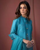 Embrace refined simplicity with the Turquesa Set by House of Mish, a stunning three-piece ensemble crafted from soft, breathable 100% viscose. The vibrant teal hue brings a luxurious depth to the contemporary kurta, designed with a sleek banded collar, a buttoned front placket, and modern three-quarter sleeves that can be styled rolled up for a relaxed yet polished look.