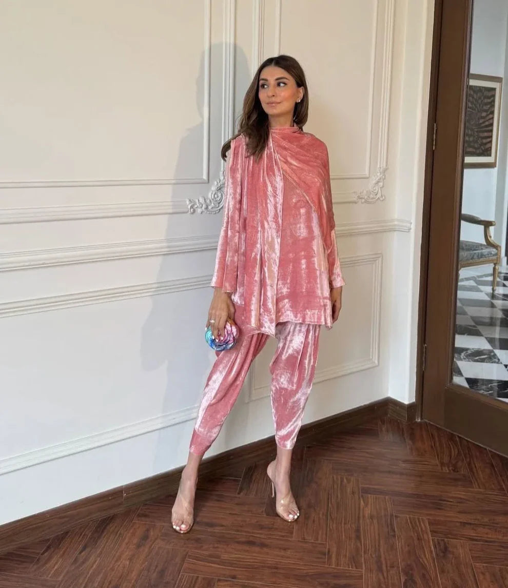Introducing the Loop Set in Dusty Rose, featuring a seamless drape that encircles the neckline and falls softly like a scarf at the front. The design creates an elegant, fluid silhouette that feels both refined and effortless.