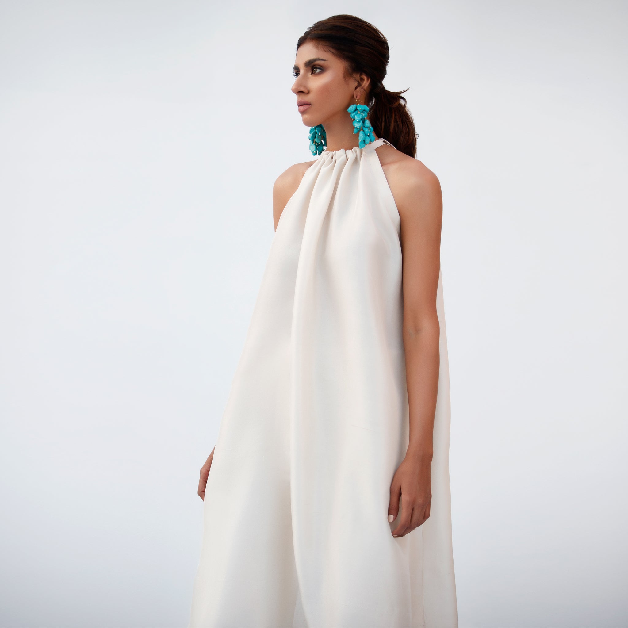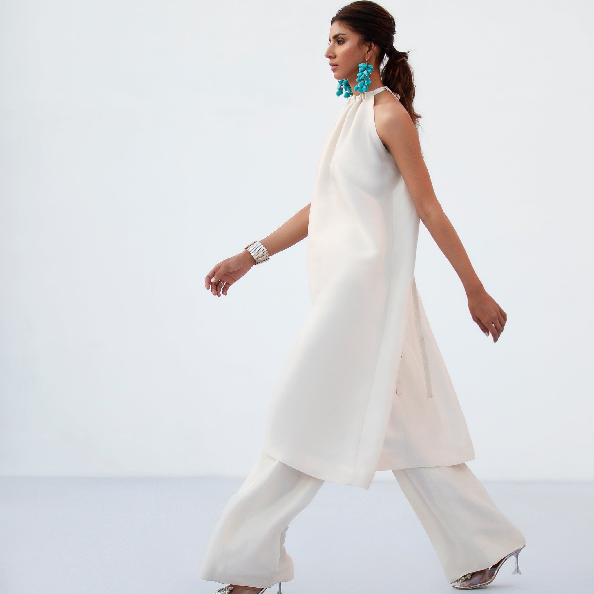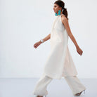 By House of Mish, this ivory ensemble features a long halter-neck kurta paired with tailored trousers, creating a clean and structured silhouette. The extended length of the kurta adds fluidity and elegance, while the halter neckline introduces a contemporary touch, making it perfect for modern festive and formal occasions.