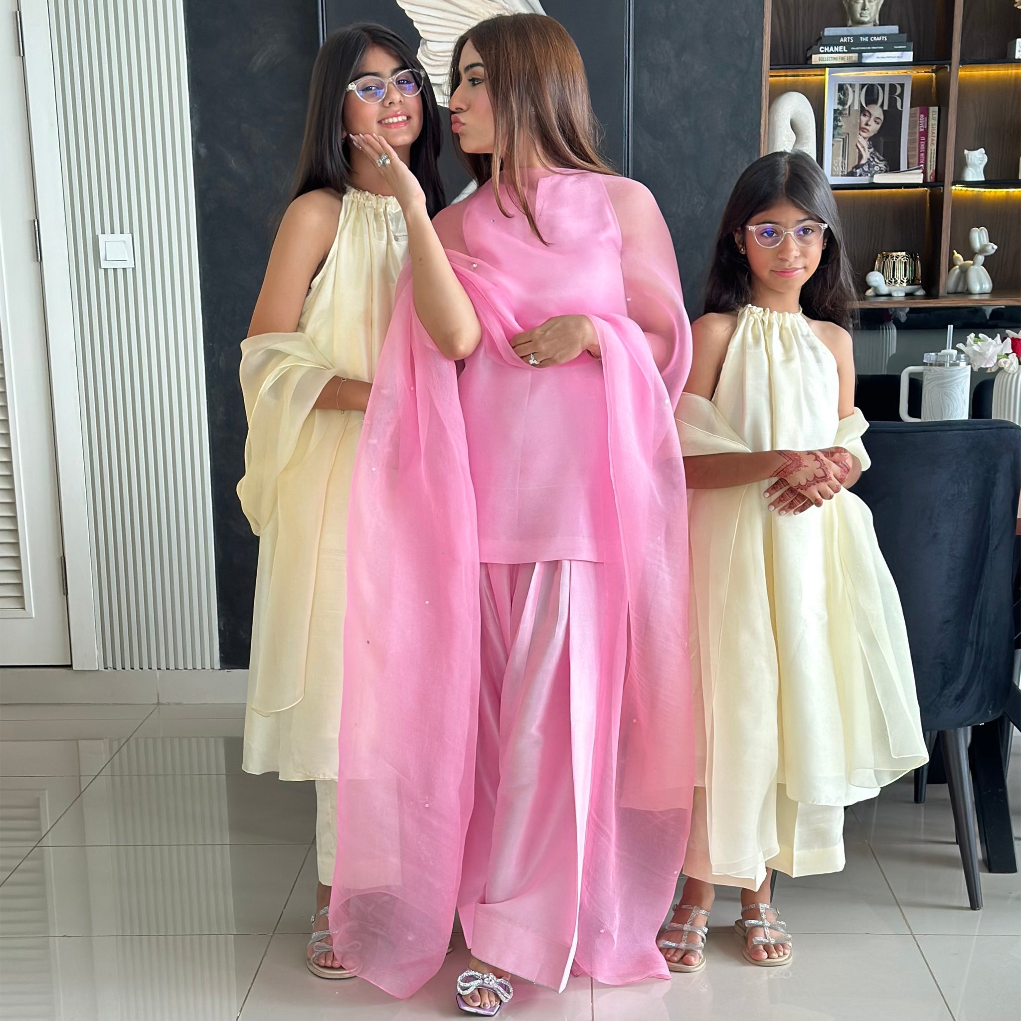 By House of Mish, this powder pink Farshi Shalwar Kameez reflects soft elegance and timeless charm. The cotton silk kurta and farshi shalwar create a refined silhouette, while the light organza dupatta adds a delicate, airy finish perfect for intimate celebrations and elegant daytime occasions.